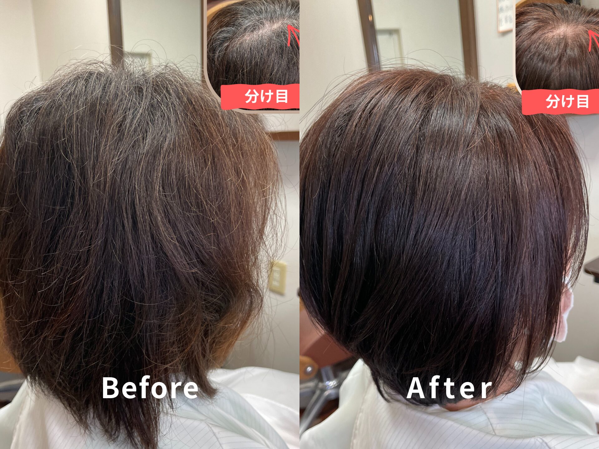今回のお客様は、分け目の白髪やうねり、パサつきによる